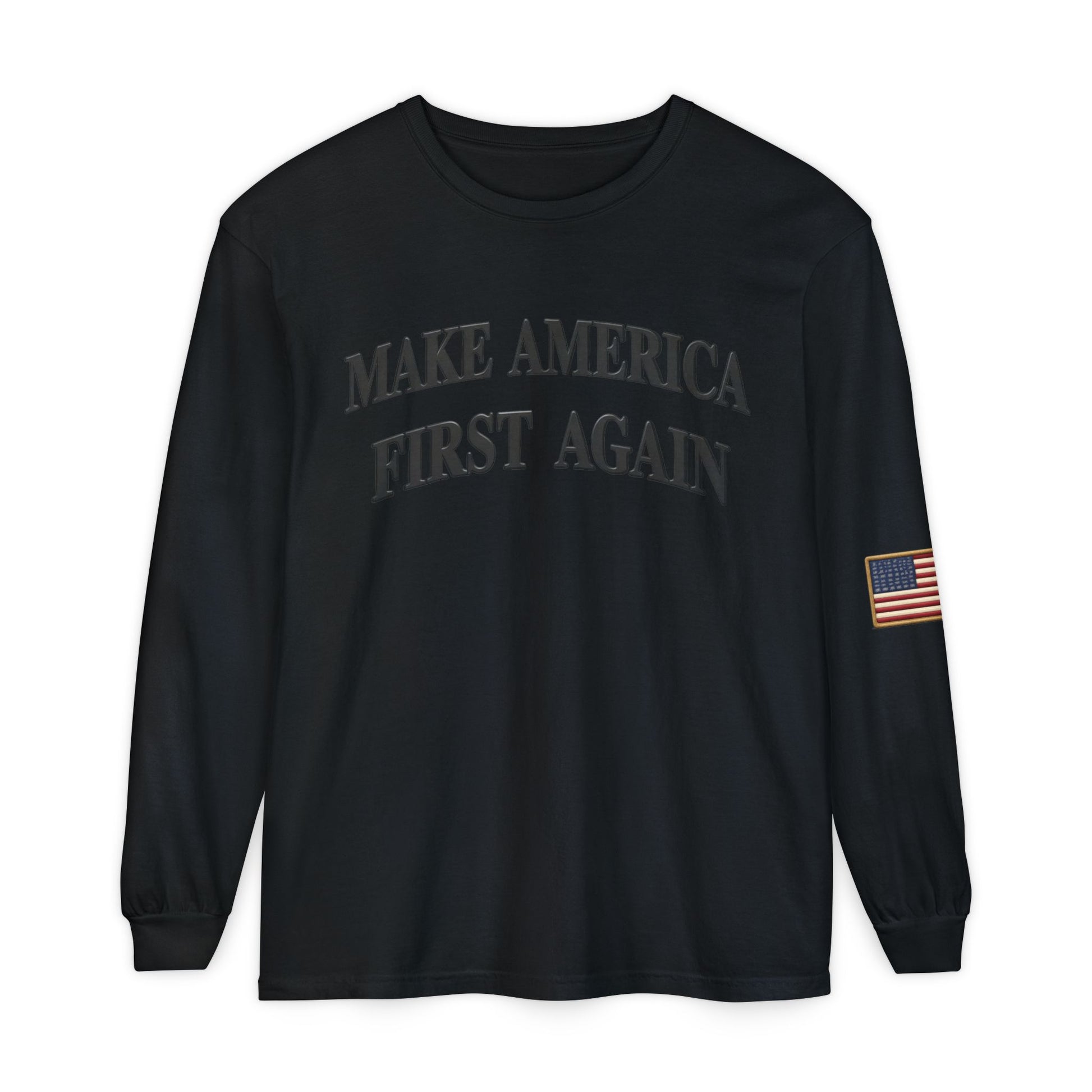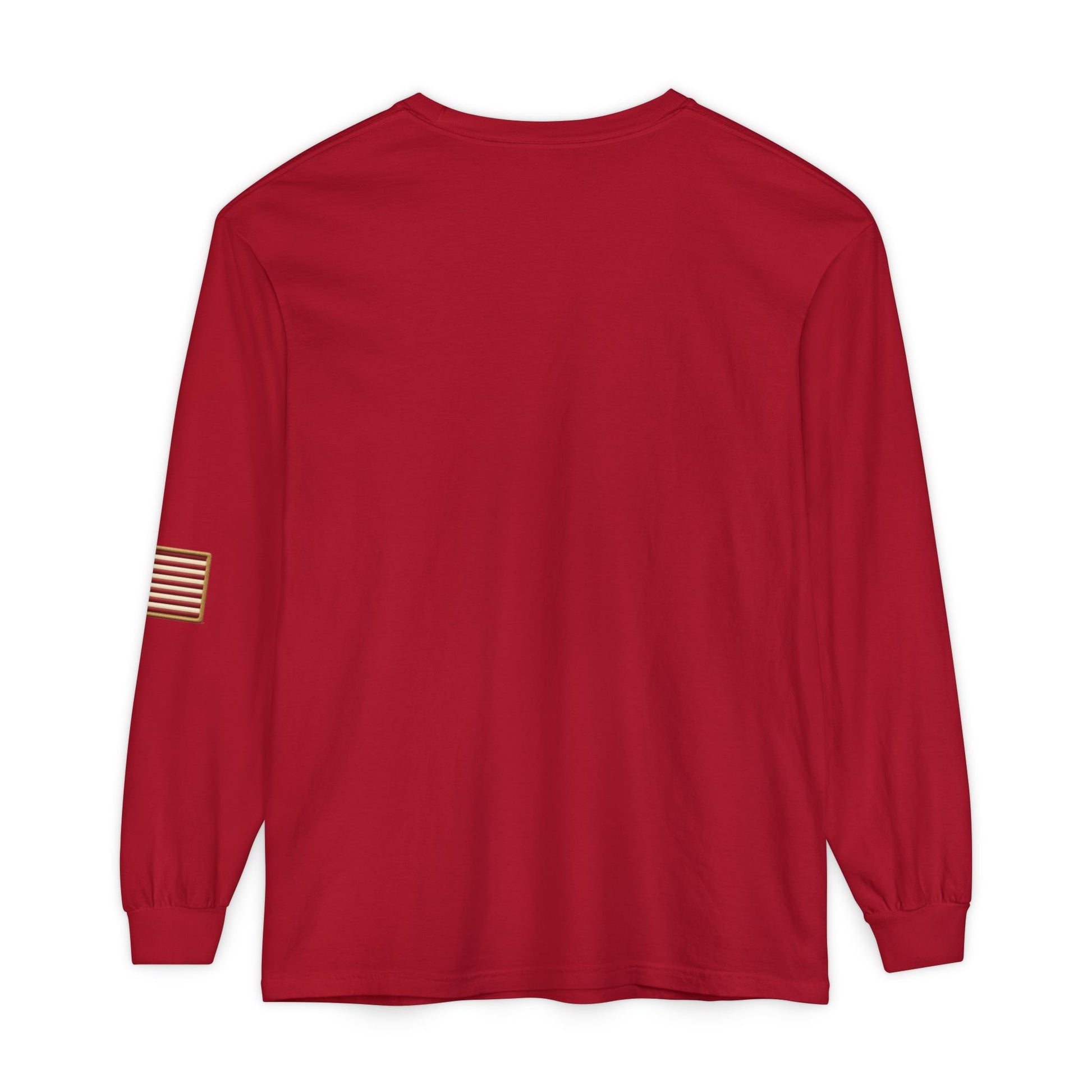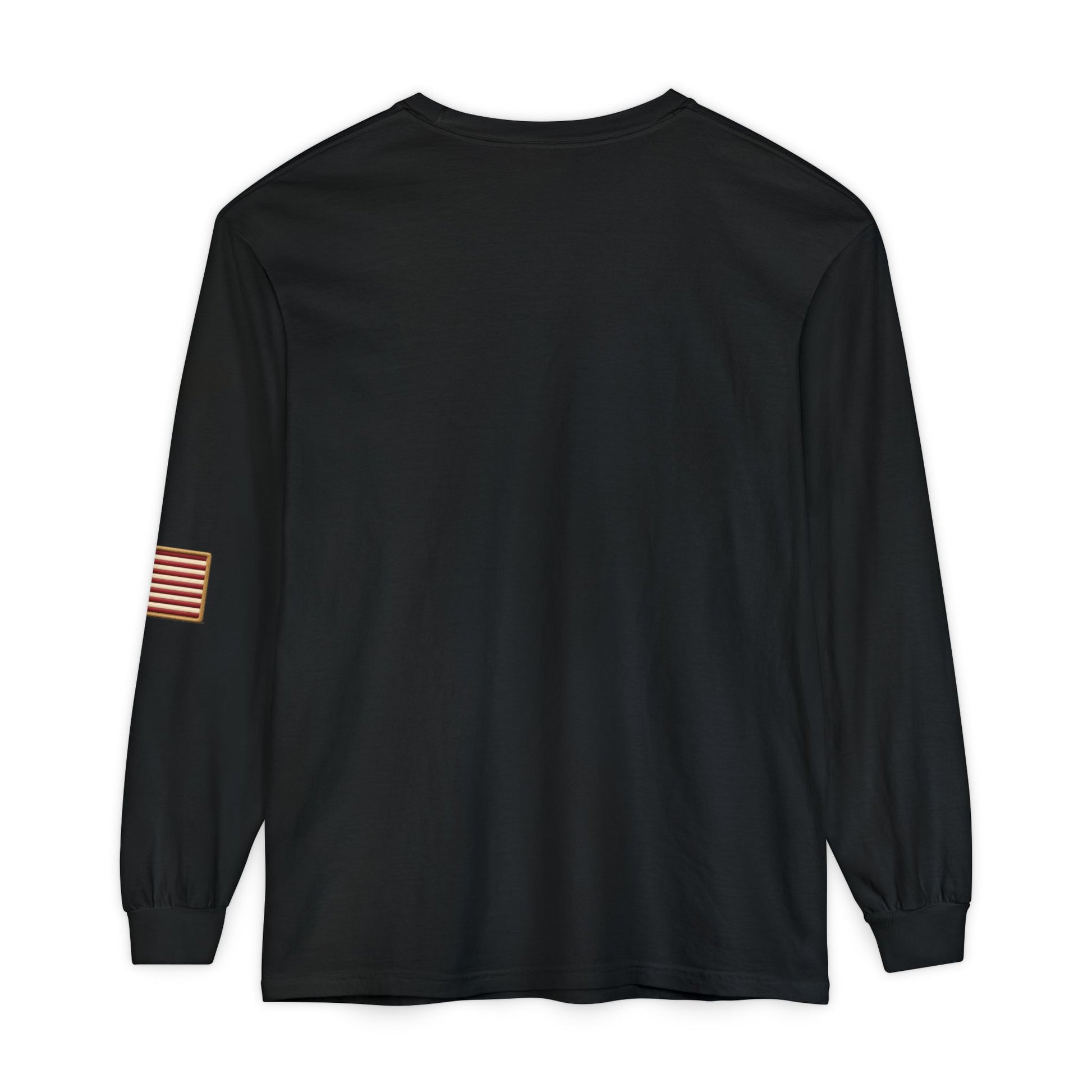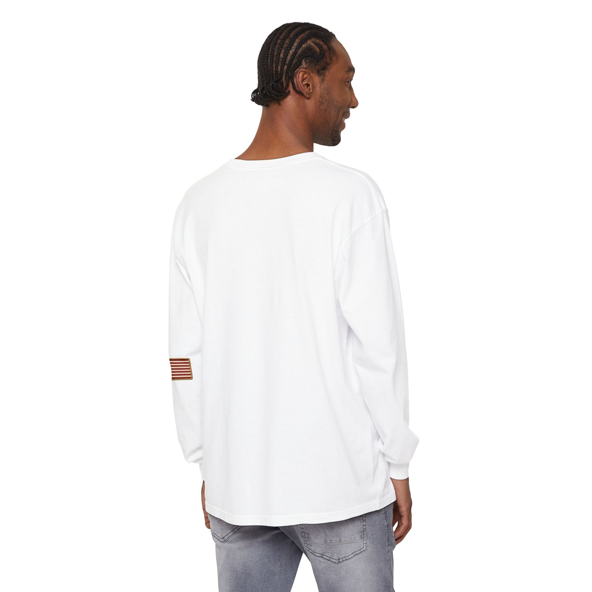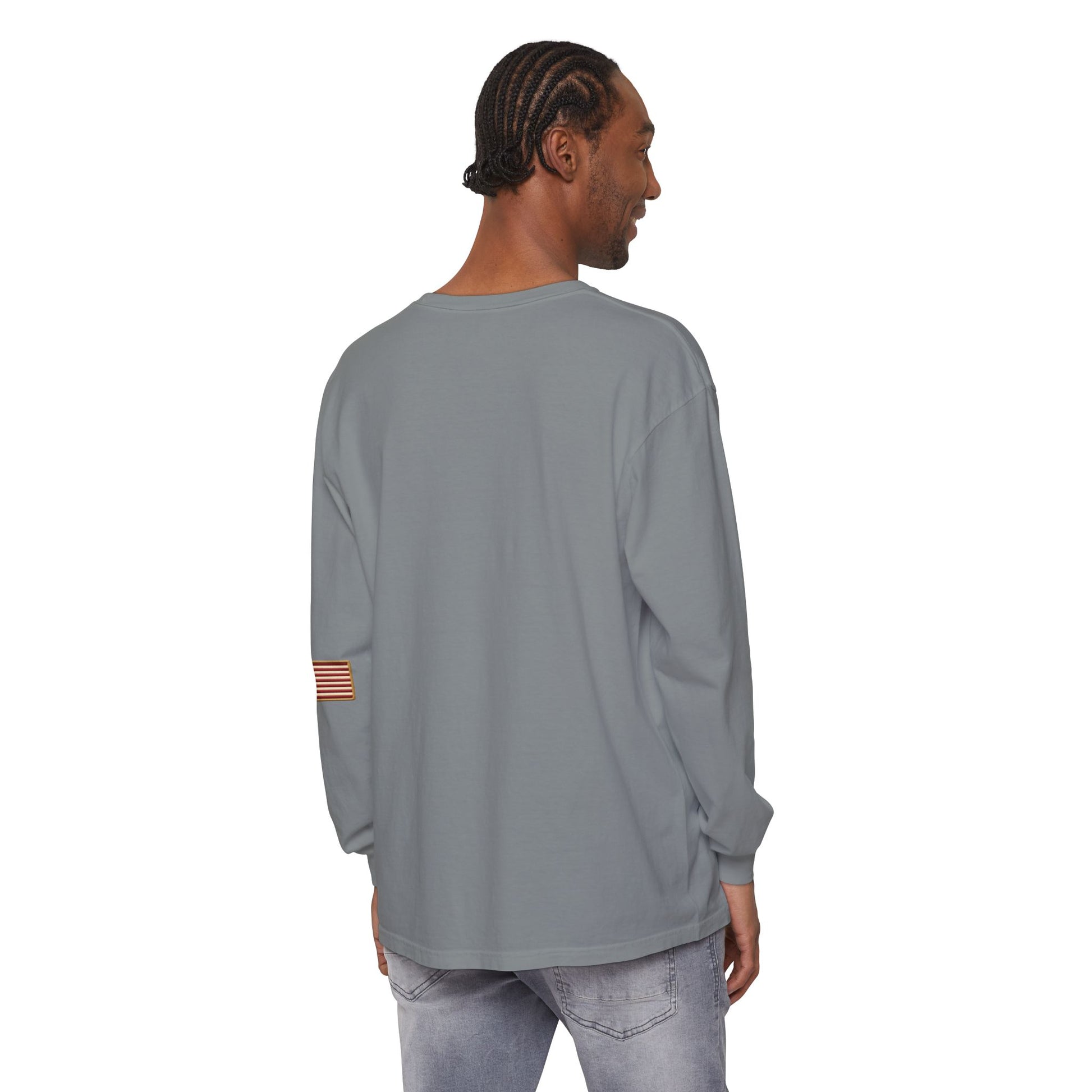 A garment-dyed long sleeve made from soft, ring-spun cotton that carries a bold, straightforward statement across the chest and a stitched flag on the sleeve. The classic fit and medium-weight fabric make it comfortable layered under a jacket or worn alone on cool days. Elastic ribbed cuffs keep sleeves in place, while taped shoulders and double-stitched hems add durability so the shirt holds its shape wash after wash. It feels lived-in from day one — muted color depth from the garment-dyeing process gives every piece a subtle, vintage look that grows more personal with wear.