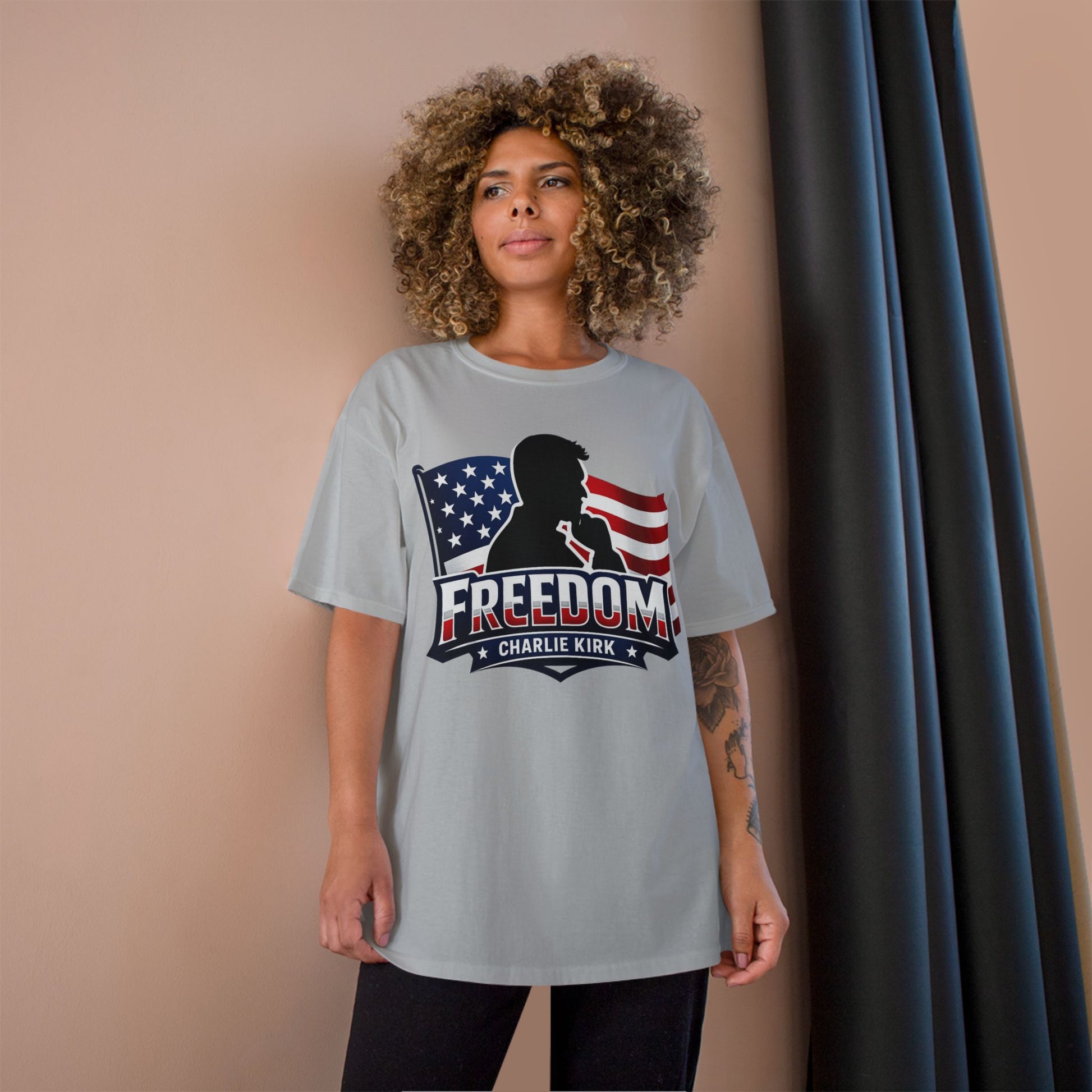 Charlie Kirk FREEDOM Champion Brand T-Shirt — American Flag Tee