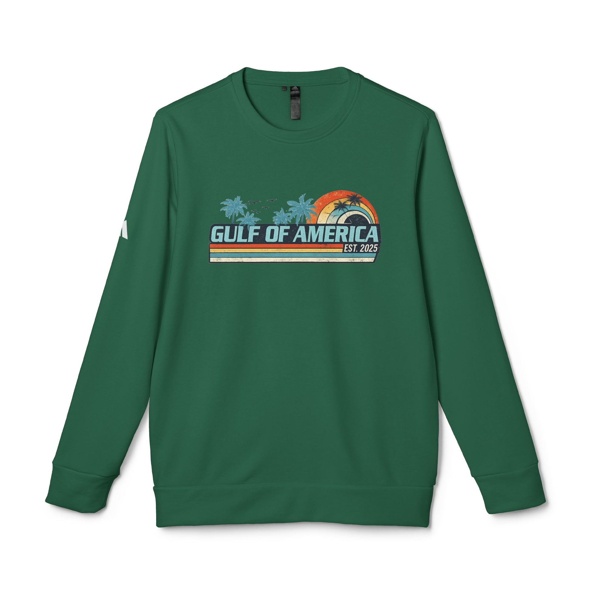 Light, warm, and quietly nostalgic — this crewneck brings a Gulf-coast afternoon into everyday wear. A sun-faded retro graphic sits across the chest, palms and a low arc of sunset tones pairing with clean, vintage lettering that reads “GULF OF AMERICA.” The medium-heavy fabric feels substantial without weighing you down, and the cuffed sleeves and hem give a neat silhouette that holds shape through repeated wear. It layers easily over tees for cooler evenings, or stands alone when you want that breezy, beach-town mood. Small branding on the sleeve keeps the look authentic and sporty while printed DTF artwork keeps the colors crisp and soft to the touch.